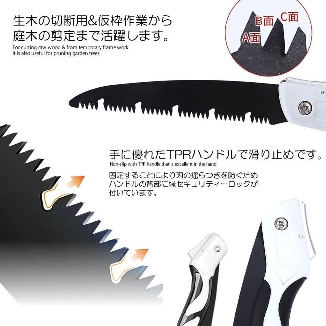 【三面歯設計】効果よく切断できると共に手に快適に設計されています。三面歯設計で太い枝を簡単に切ることができます!生木の切断用&仮枠作業から庭木の剪定まで活躍します。