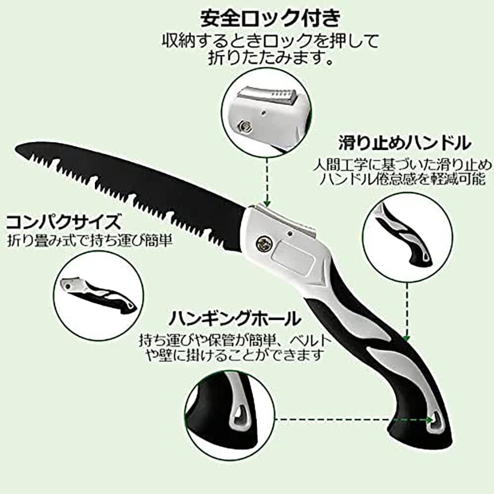 【安全ロック付き】安全ロックを押すとの鋸歯がすばやくに収納可能。収納後刃はハンドルに完全にフィットするため、閉じたときに歯が露出することはありません。持ち運び中の安全性が非常に高くなります。