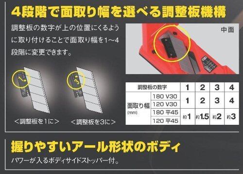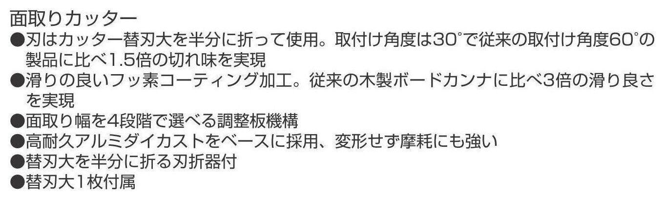 ●4段階で面取り幅を選べます。●【用途】●石膏ボード用面取りカッター。●【機能・特徴】●刃はカッター替刃大(L型替刃)を半分に折って使用します。●取付け角度は30度で従来の取付け角度60度の製品に比べ1.5倍の切れ味を実現しています。●滑りの良いフッ素コーティング加工。従来の木製ボードカンナに比べ3倍の滑り良さを実現しています。●面取り幅を4段階で選べる調整板機構です。●高耐久アルミダイカストをベースに採用、変形せず摩耗にも強いです。●【仕様】●面取角度:45度。●替刃大1枚付属。●刃折器付。●本体色:赤。●製品重量:200g。●【材質】●本体:アルミダイカスト。●【商品サイズ】幅60×高さ180×奥行29mm 重量200g●商品コード:4975364056313●JANコード:4975364056313●ブランド名:タジマ●商品名:ボードカンナ180平45●規格:TBK180-H45●【注意事項ほか】●刃物ですので取り扱いにご注意下さい。使用後の折れ刃は、適切な処理をして下さい。