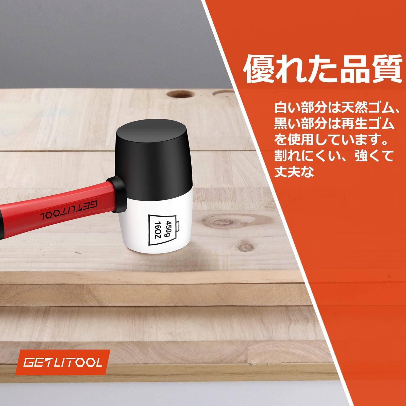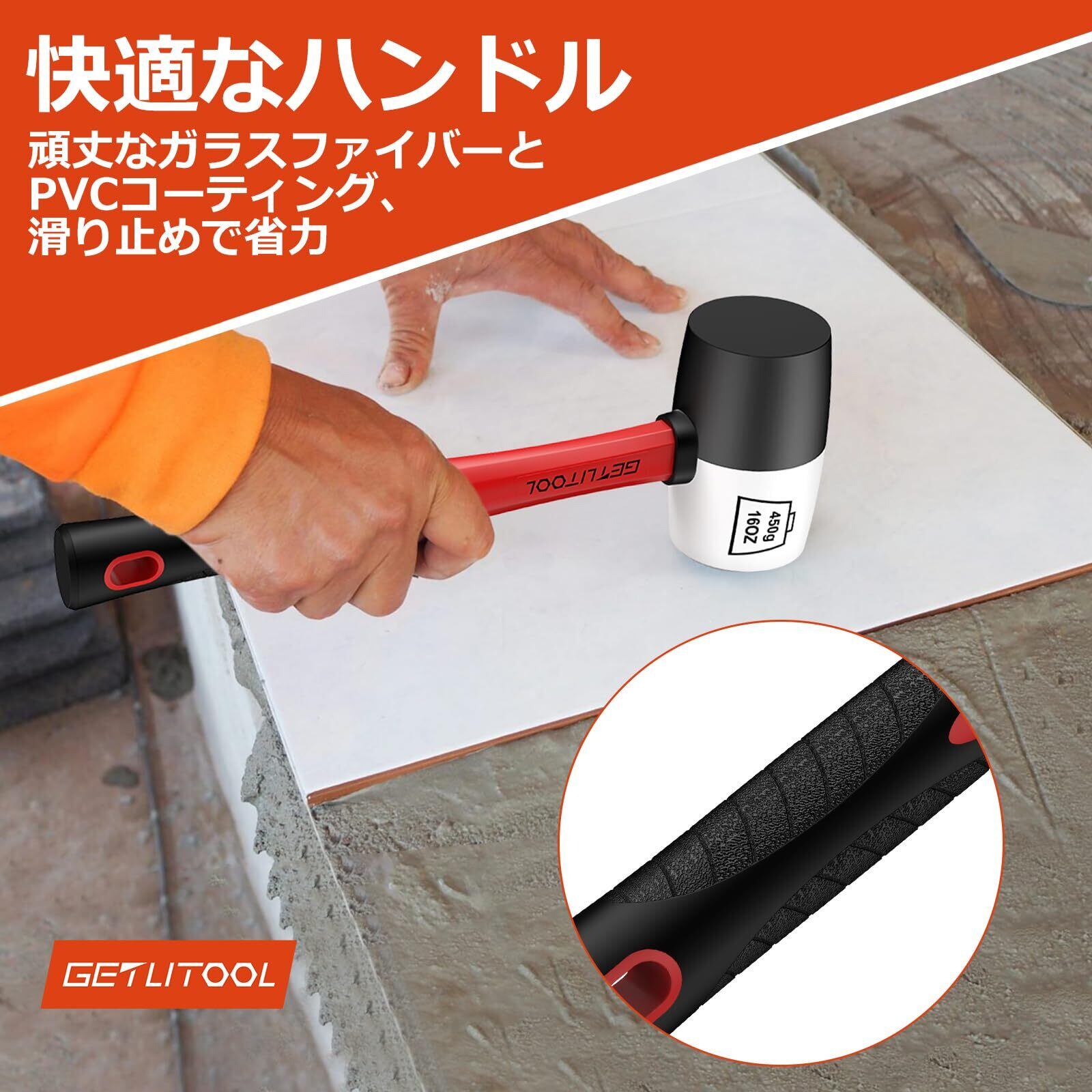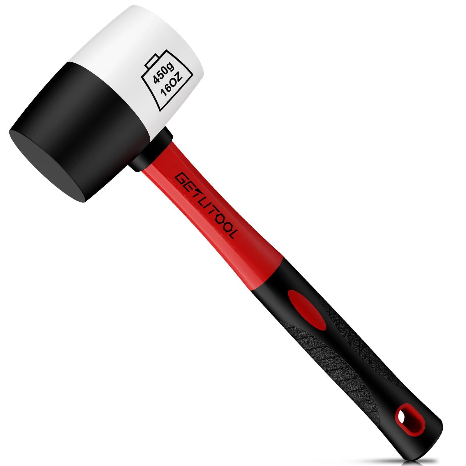 GETLITOOL ゴムハンマー 天然ゴム製硬質ゴムハンマー ⌀55mm 防滑・衝撃吸収ガラスファイバーハンドル付き 多用途な両面ソフトフェイスハンマー 1LBS 黒/白
