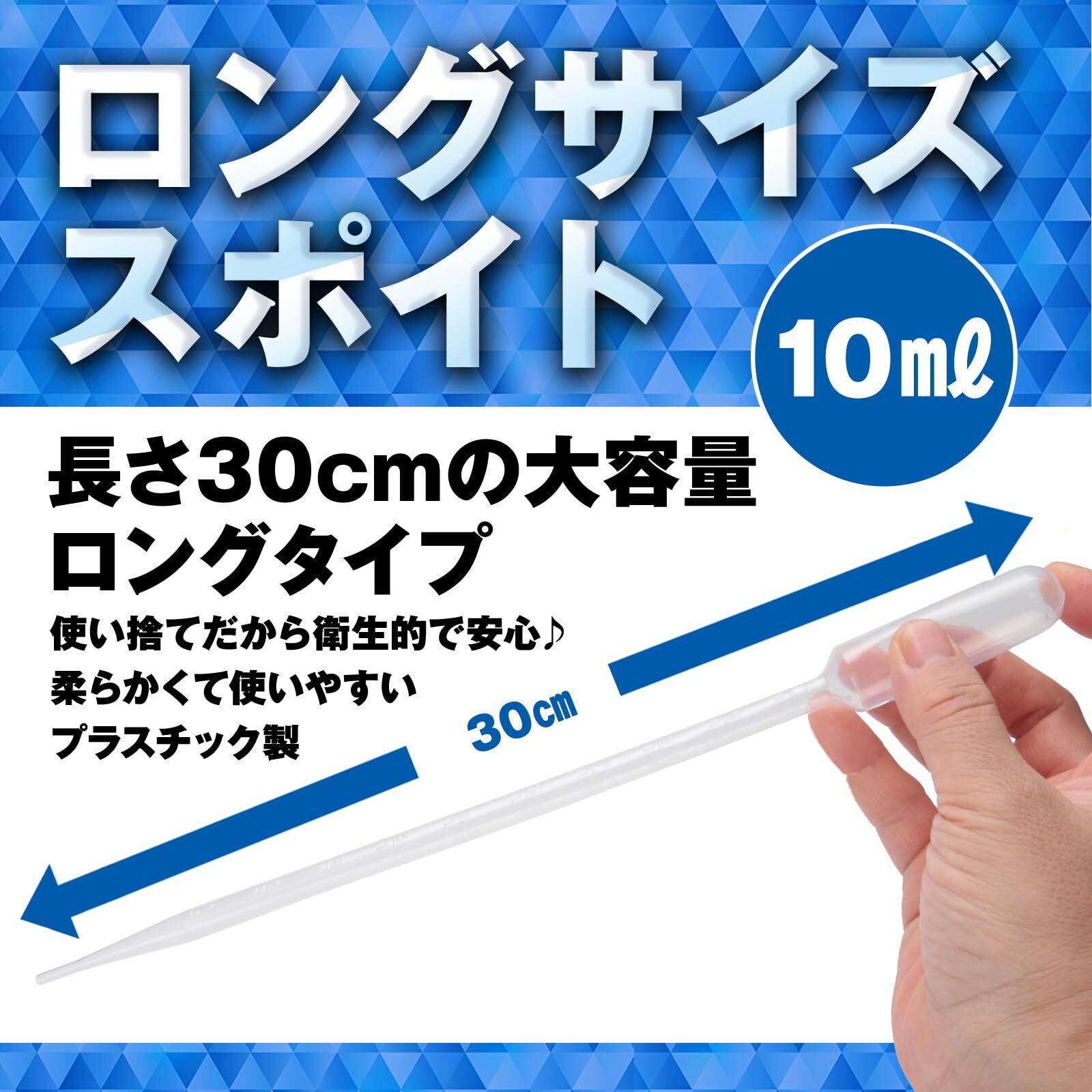 【使い捨て大型スポイト】 プラモデル製作・アクアリウム・科学実験・園芸用など様々な分野で活躍するロングサイズのスポイト。薬剤や塗料に触れることなく手軽に処理でき、安全&清潔にお使いいただけます。 ●大容量10ml ●30cmのロングサイズ ●1mlの目盛付きで計量も簡単 ●使い捨てだから衛生的 【使いやすい柔らかプラスチック】 つまみ部分が柔らかく、軽い力で作業できる柔らかいプラスチック製。長時間使用する際も負担が少なく楽にお使いいただけます。つまむ部分の大きさと、吸い込む軸の太さがバランス良く設計されており、吸引力もバッチリ!中身の液体の色と量がわかりやすい透明タイプで、計量も簡単です。 【プラモデルを作る方に】 プラモデルにエアブラシで塗装を行う場合など、専用の溶剤で塗料を薄める際に必須のスポイト。ベストな希釈率は塗料毎に異なり、気温や湿度によっても変わってくるので、希釈の度合を見ながら作業を行う必要があります。うすめ液の容器が大きいと、溶剤を抜き取るときに誤って容器の中にスポイトが落ちてしまうことも・・・。このスポイトなら30cmのロングサイズなので、容器に挿しっぱなしでも大丈夫!作業に集中できて便利ですよ 【観賞魚の飼育に】 熱帯魚やメダカ、金魚など、小型水槽で飼育する際に活躍するロングタイプのスポイト。赤虫などの餌やりや、水槽内に沈殿したごみや残餌の除去、金魚鉢程度の小さい水槽なら水換えもOK!水草レイアウトの隙間のお掃除も楽ラクです。多用途に使えて手を濡らさずに作業できるからオススメ 【園芸・ガーデニング用に】 面倒な液体肥料の希釈が楽ラクに!ボトルのキャップで計量してこぼれたり、手に付かないよう気を遣う心配もありません。直接注がずにサッと簡単に計量できます。ロングサイズだから大きめのボトルでも大丈夫 【その他にも様々な用途に】 自分次第で使い道は色々すぐに使えるよう予めストックしておくと便利です。 ●研究開発職 ●大学や高校の授業、研究室・ゼミ、科学部などでの実験用に ●化粧水やシャンプーなどコスメの小分けボトルへの移し替えetc・・・ 【セット本数をお選びください】 「まずはお試しに・・・」「少しだけ使いたい!」という方に向けた少量セットorたくさん使いたい方、経済的にまとめ買いしたい方にピッタリのたっぷり入ったおトクなセットの2種類をご用意しております。 ①10mlスポイト×5本入り ②10mlスポイト×100本入り