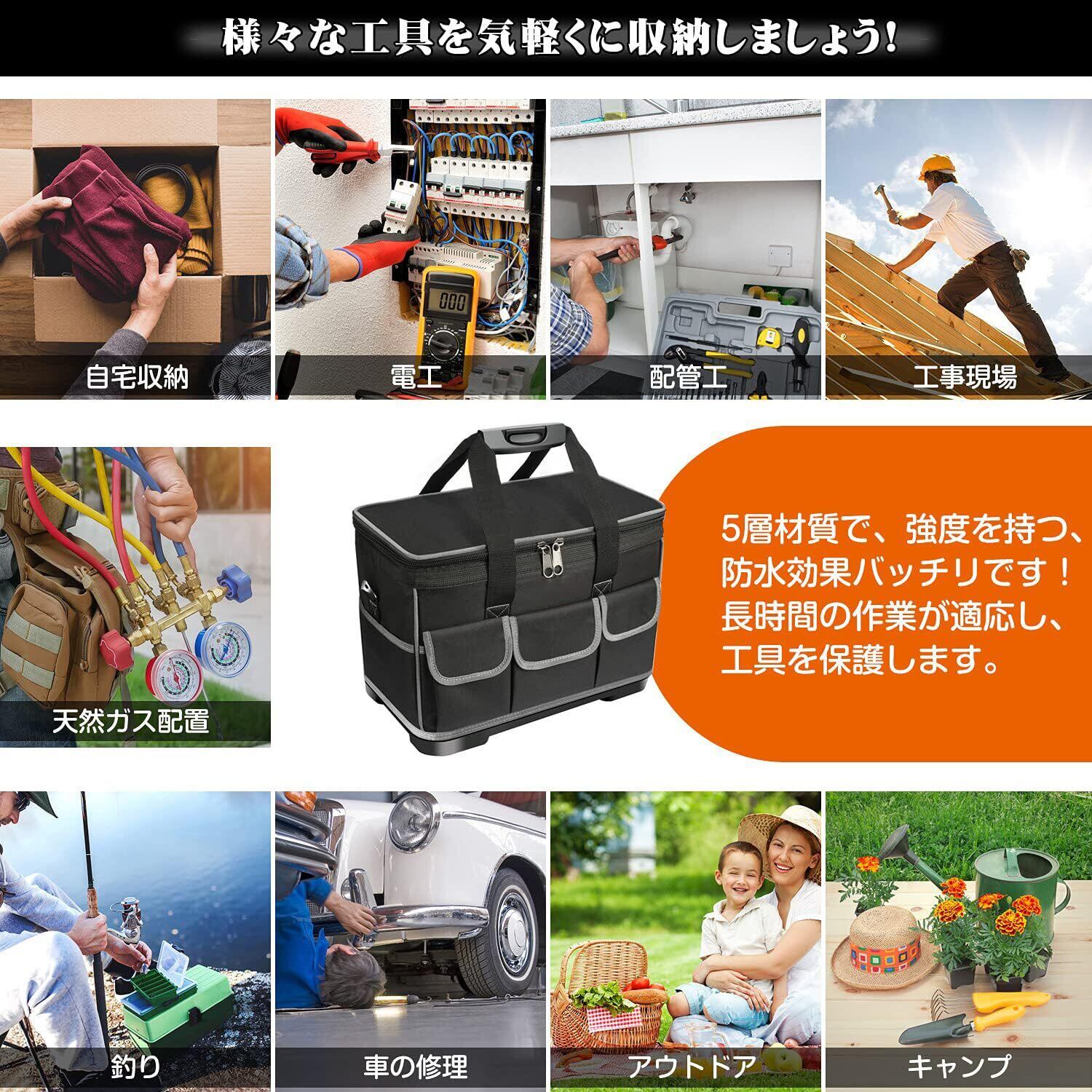 【工具バッグセット】肩掛けベルトが付き、出掛ける場合も非常に便利です。また、工具袋は大容量で、家庭の修繕用具でも外出作業道具でも収納でき、長持ちします