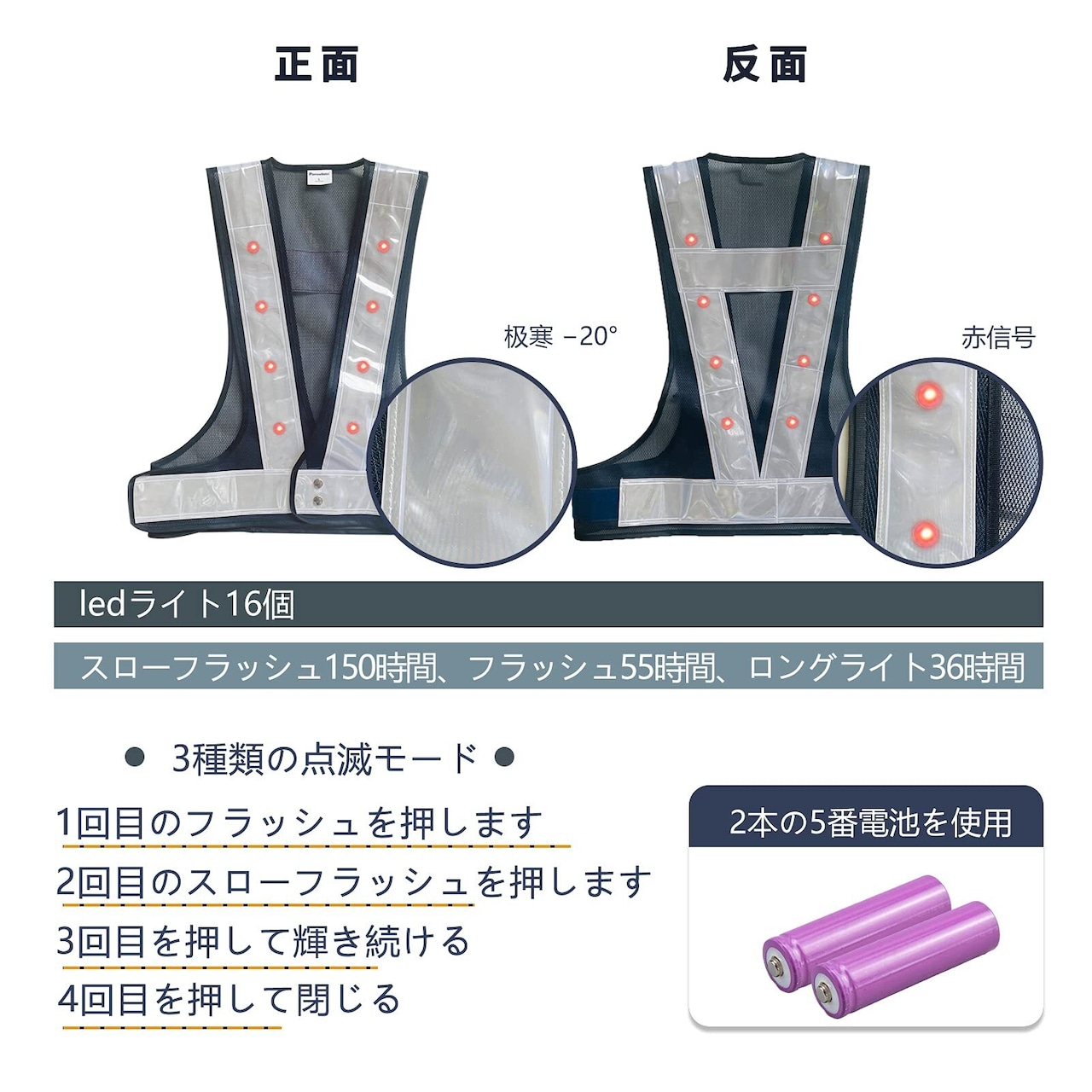 3つの動作モード:16個のLEDライトバーを備えた反射ベストと3つの異なる照明モード:連続、低速点滅、または高速点滅。 150時間ゆっくり点滅し、55時間速く点滅し、36時間点灯し続けます。