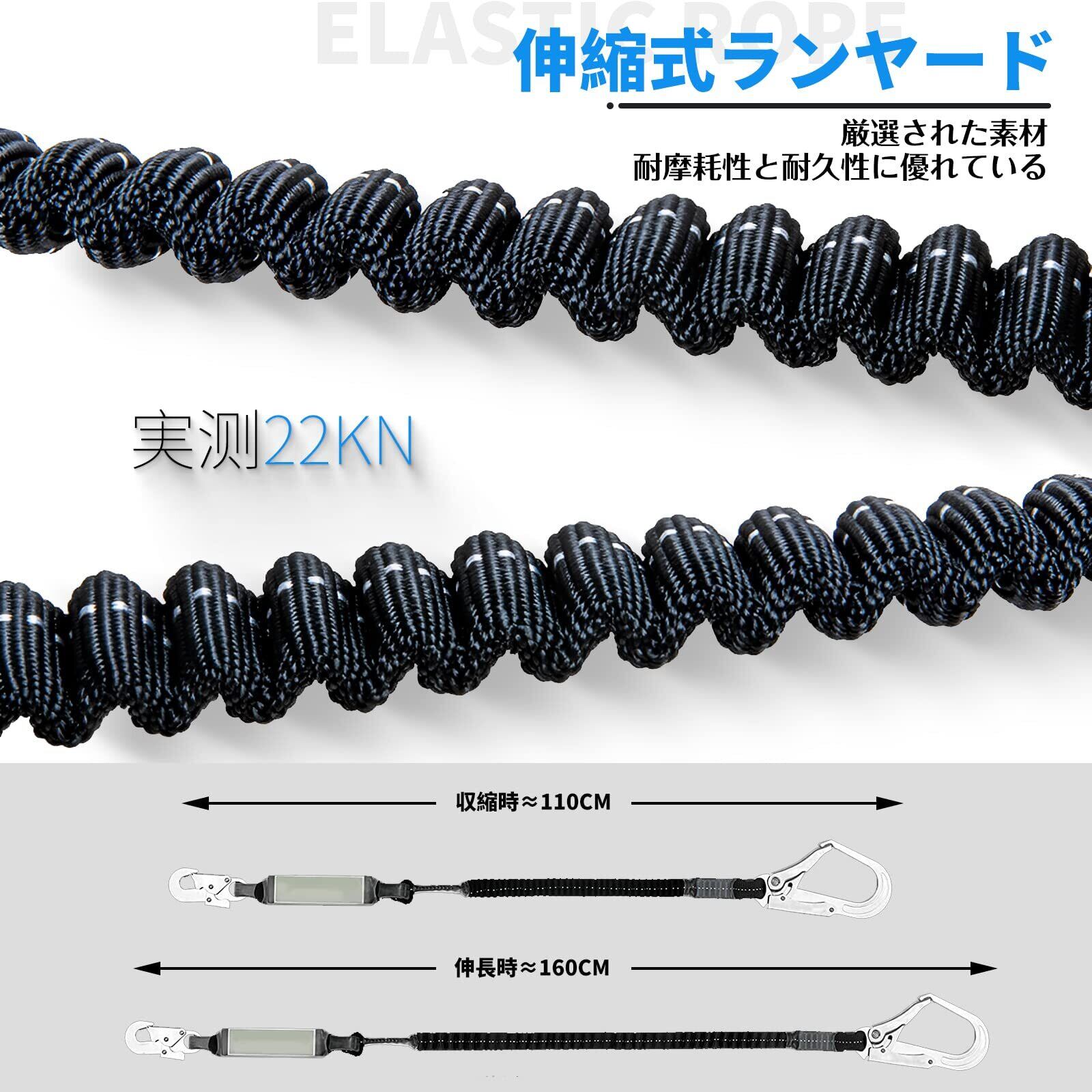 【合金製フック/伸縮式ハーネス】①航空のクロムメッキ鍛造スチールフックを採用しており、熱間鍛造フックはより大きな衝撃力に耐えることができ、強度を確保しながら可能な限り軽量化を図りました、建設をより安全にします。 ②墜落制止用器具 胴ベルト型 1丁掛けの平ベルト接続部は複数の補強ステッチを採用し、強度が高く張りが強く、縫製が滑らかなのが特徴で、安全ロープの寿命と安全性を向上させます。③胴ベルト型ランヤード仕様:ランヤード長さ:約1.1m、伸長時:約1.6m。参考適合身長:165㎝~185㎝。新規格安全帯約重量:1.1kg、使用可能質量:100kg以下。引張強度約2200KG(22KN)ランヤードの種別:第一種/最大自由落下距離:2m。④ハーネス安全帯は使わない時に短く縮んでいますので、移動時の引っ掛かりなどを抑えることがありません。安全帯は伸縮式ベルトで作業中も邪魔になりづらいです。