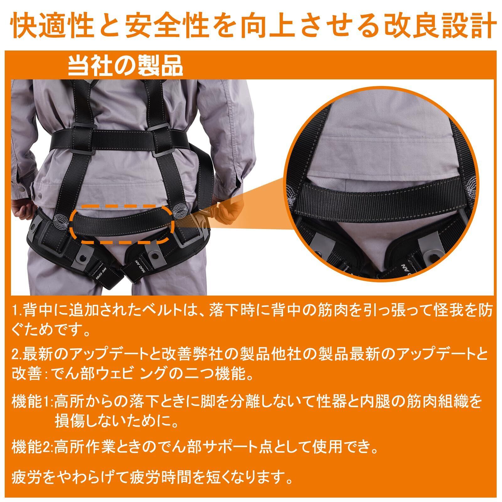 【調整可能なフルハーネス 新規格】:高所での作業を容易にするためには、適切なフィットが重要です。当社の安全帯は、ユーザーが重量内で適切にフィットするように 6 点の調整を提供します。ハーネスが適切にフィットするように、すべてのバックルが接続されていること、レッグ ストラップとショルダー ストラップがぴったりと合っていること、チェスト ストラップが胸部の中央にあることを確認してください。