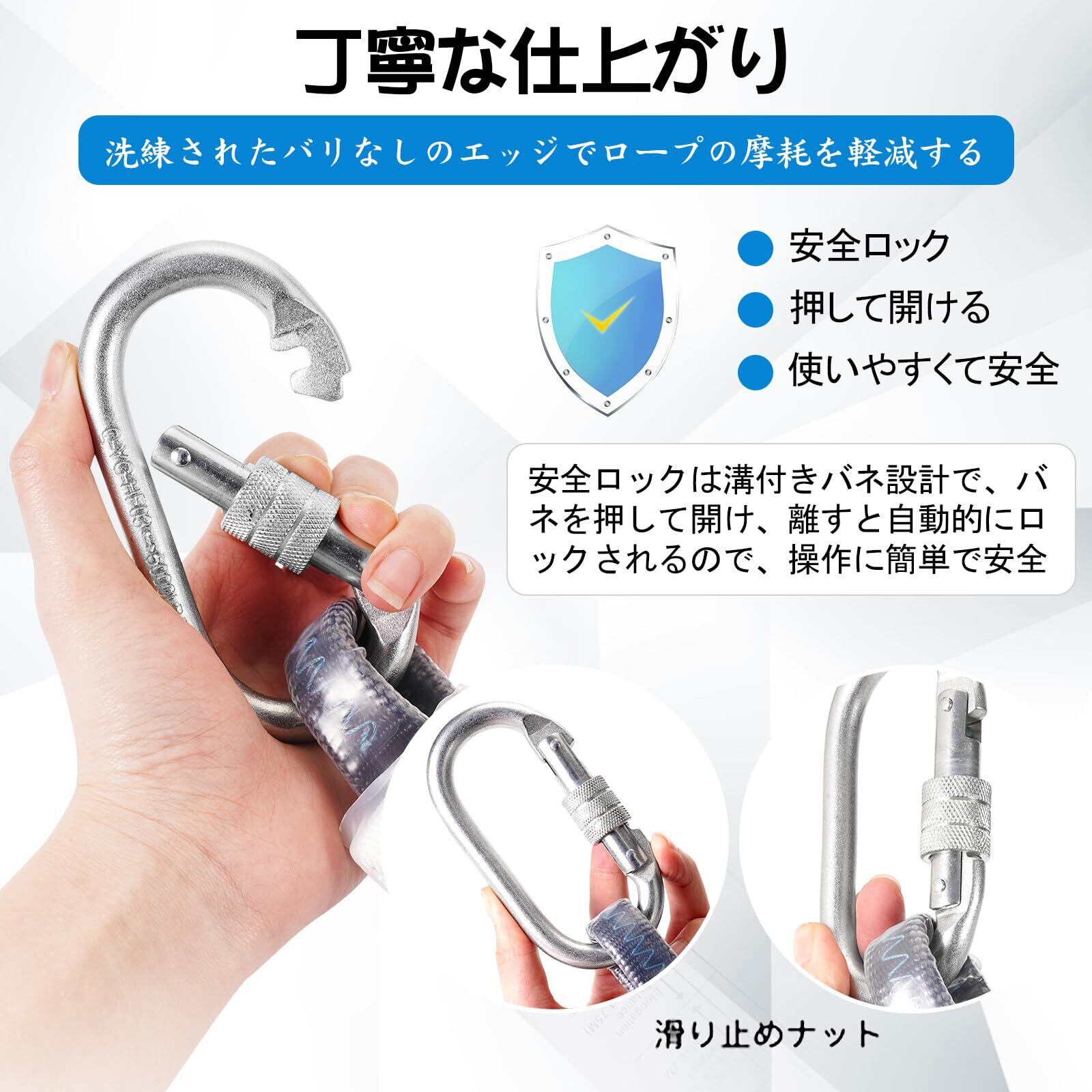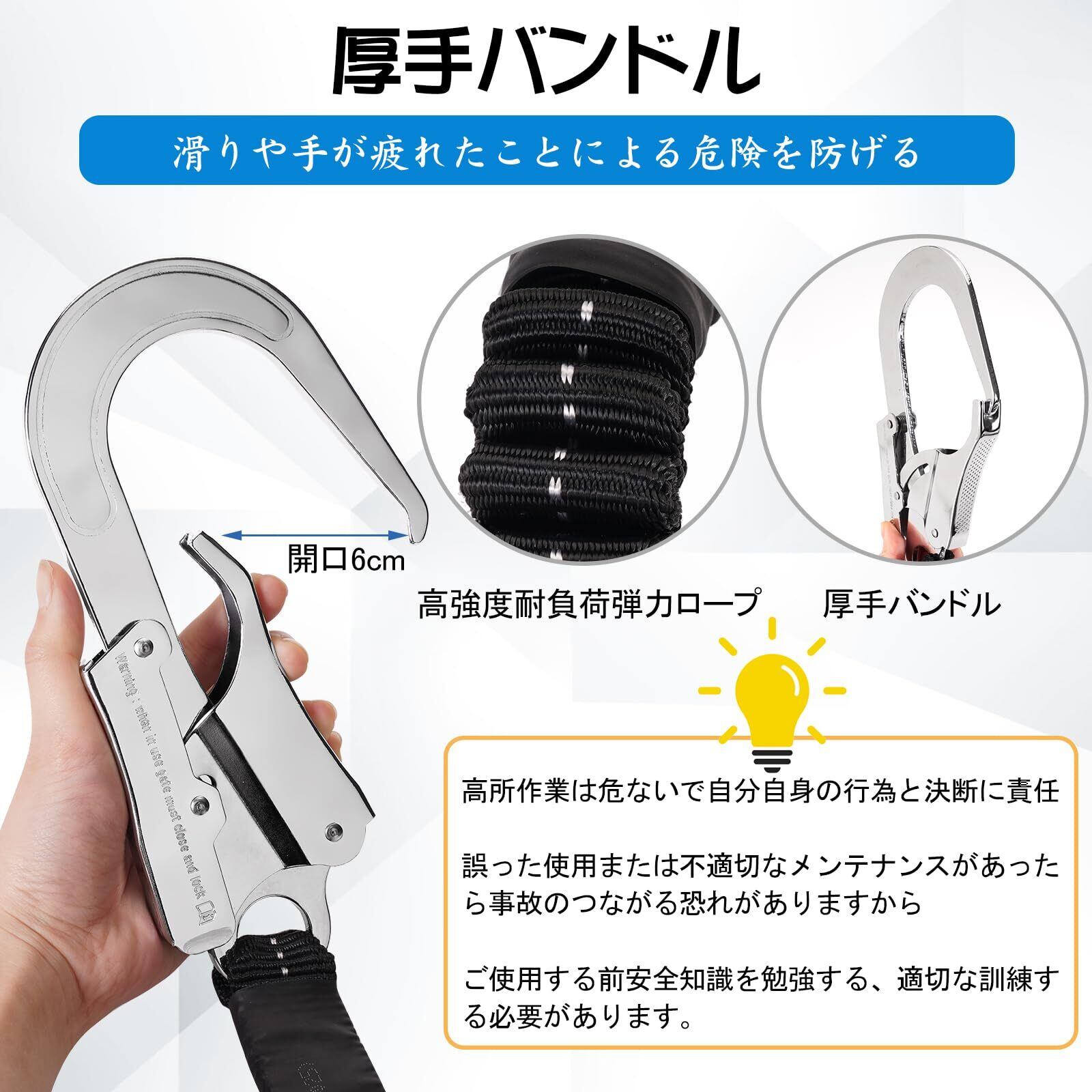 【ご使用の前に】:高所作業は危険で使用者ご自身が行動と判断の責任を持っています。高所作業やクライミングなどは非常に危険ですので、自己の行動と判断に責任を持ち、適切なトレーニング(技術および安全対策知識)を事前に習得してからご使用ください。誤った使用または不適切なメンテナンスがあった場合に、事故につながる恐れがありますので、ご使用の前に適切な訓練(技術およびセキュリティ対策の知識)と勉強が必要です。
