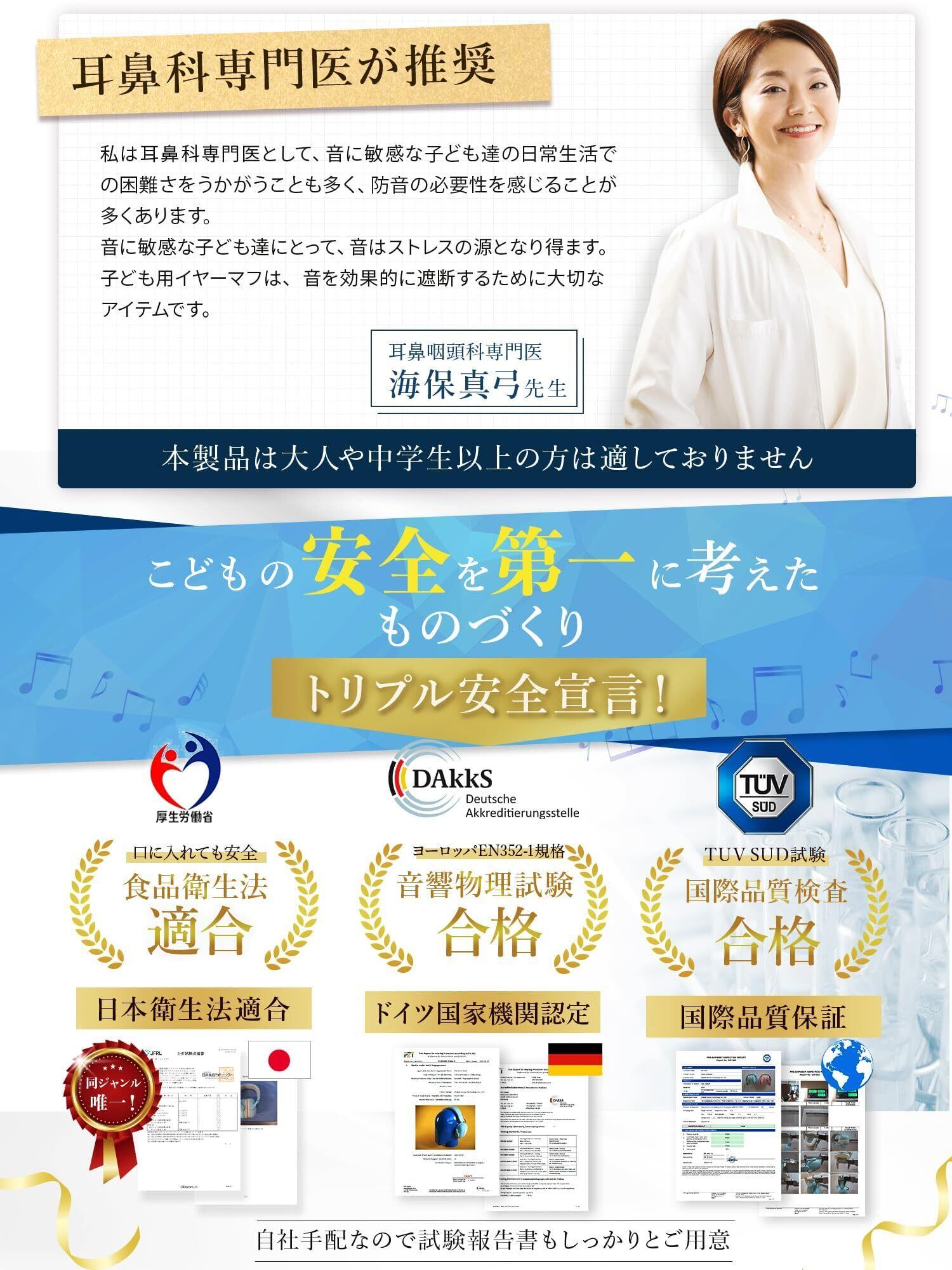 【当社だけ!イヤーマ唯一!食品衛生法試験実施】 子どもは遊びから学んで成長し時には口に入れる事がありますが、本来イヤーマフは食品衛生法非適用品なところを当社では子供の安全を優先し試験を実施確認をしています。口に入れても安心のお墨付きイヤーマフは当社だけです