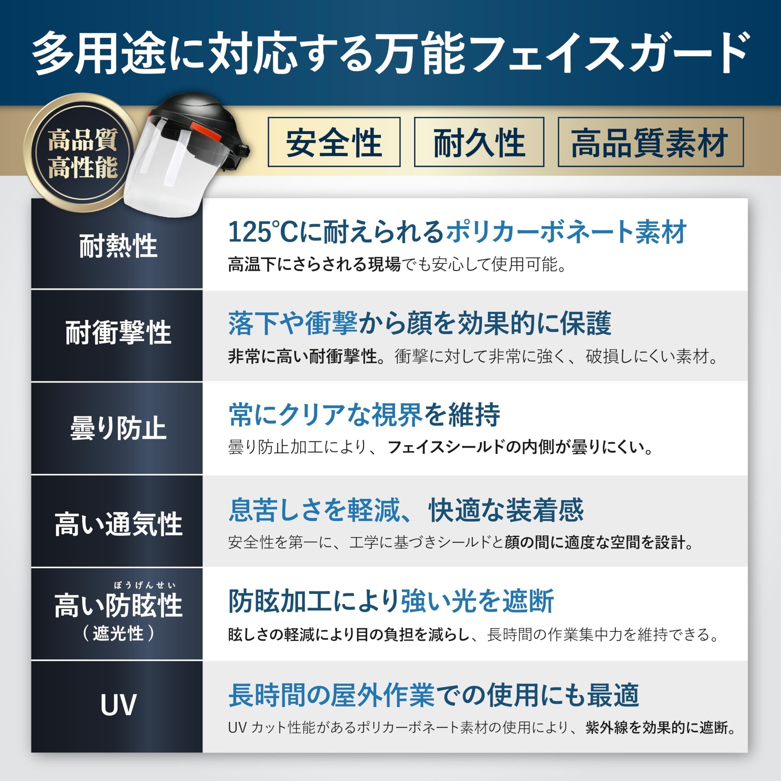 【素材・サイズ・用途】素材:ポリカーボネート サイズ:全長345mm(シールド部210mm)、幅335㎜、頭囲505-620mmにて調整可能、重量320g 男女兼用、用途:工事、溶接、DIY、除草作業、草刈り、薬剤散布、飛沫現場、粉塵現場、重機材、現場作業、建築、土木、サバイバルゲーム等