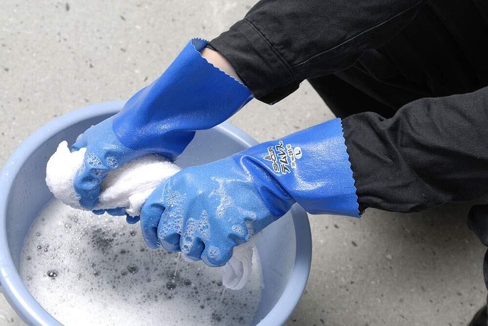水は通さず、汗などの湿気は外に放出することでムレを軽減する、透湿防水のポリウレタン手袋(裏布付)。 嫌なゴム臭さがなく、ムレにくくサラっと快適で、汗臭くなりにくい。 とても軽く柔らかいため、手にストレスがかかりにくい。 洗剤や漂白剤、油に強く、炊事や掃除、消毒などの水回り作業におすすめ。