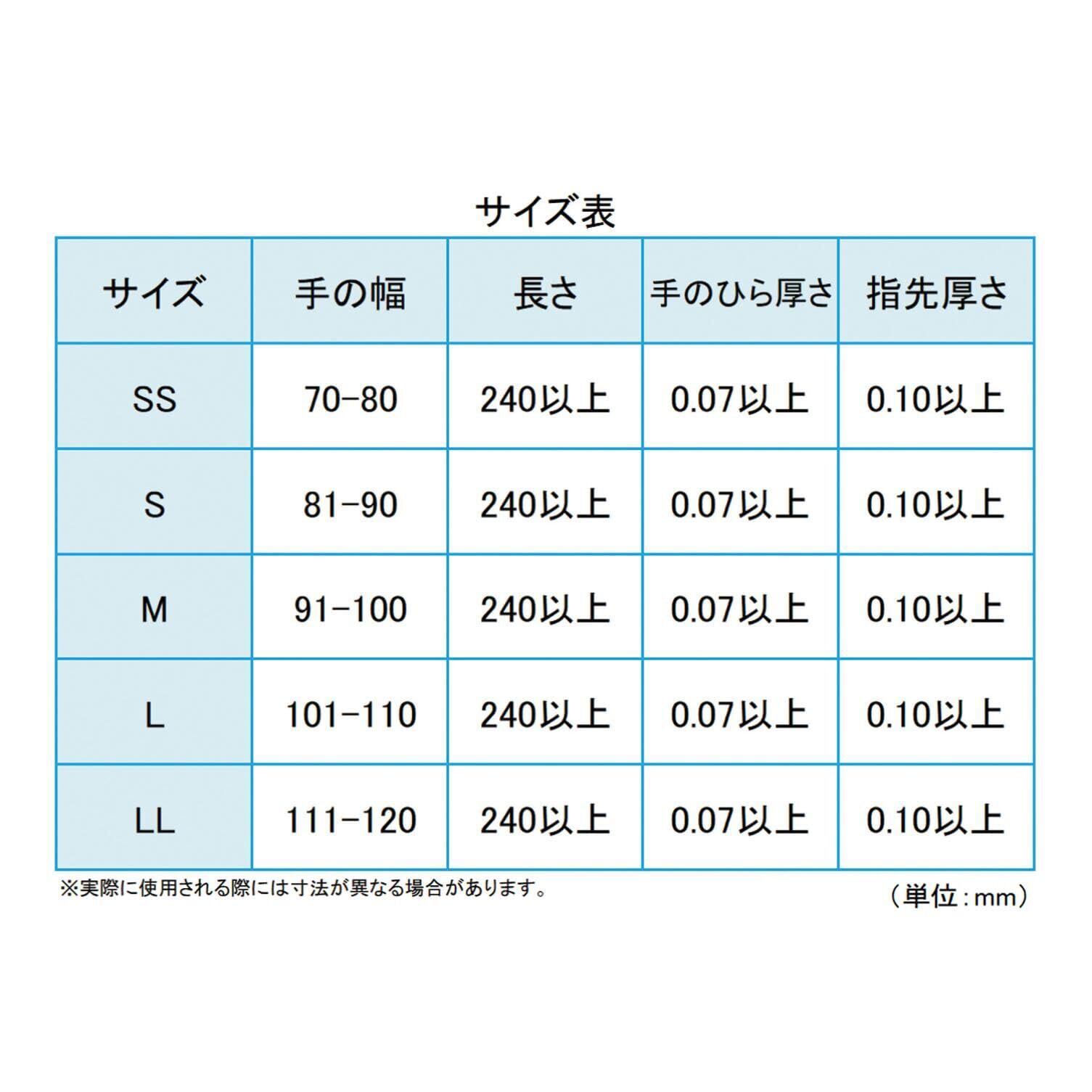 [製品全長] 240mm [掌の幅] SS:70~80mm、S:81~90mm、M:91~100mm、L:101~110mm、LL:111~120mm