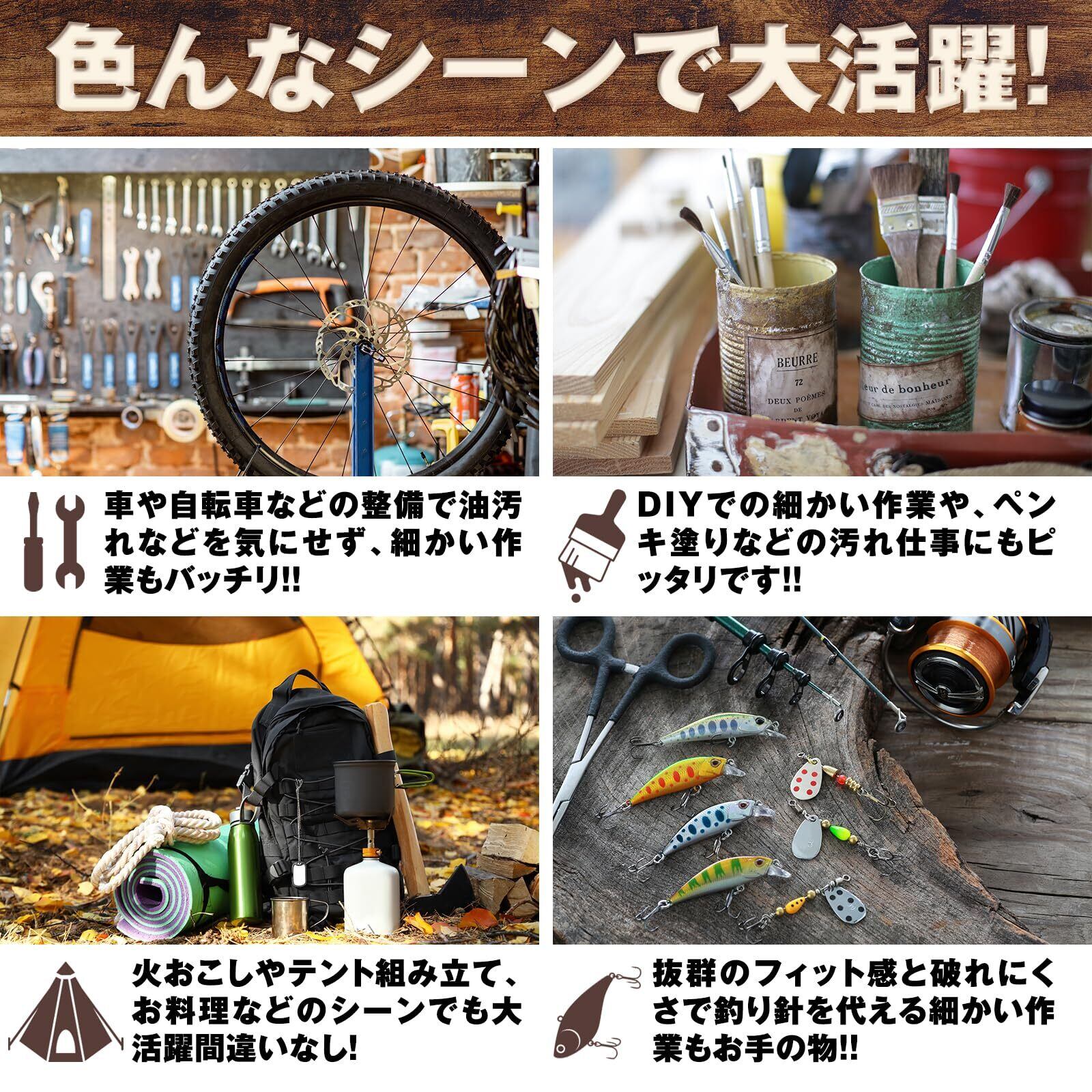 【幅広いシーンで活躍】高気密で耐油性&耐薬性に優れ、様々な用途に使用可能。車やバイク、自転車の整備など油汚れが気になる作業・洗車・清掃・ペンキ塗りや塗装などDIY・キャンプやバーベキューでの火起こしやテント設営、調理など食品の取り扱いもOK・釣りなど細かい手作業を必要とするアウトドアのレジャーにもオススメ!