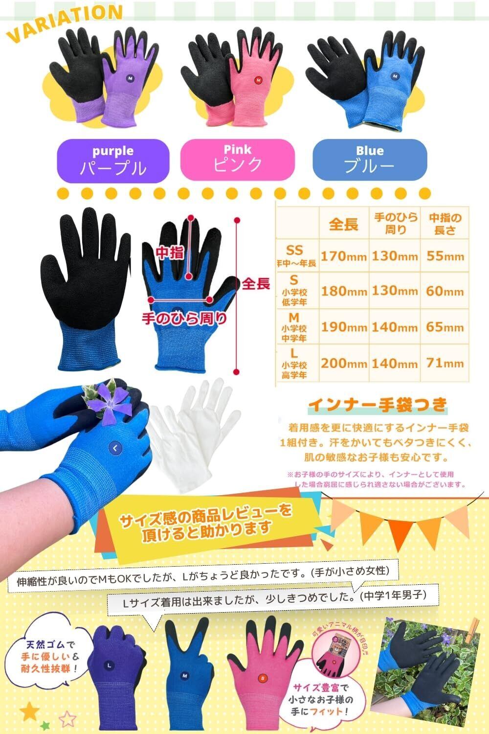 個性を輝かせるカラーバリエーション!お気に入りの色でおしゃれに。子供たちが喜ぶブルー、ピンク、パープルの3色展開で、こども達のお気に入りの色を選ぶことができます。多用途に活躍する子供軍手は、アウトドアだけでなくキッズの日常の活動にもぴったりです。また、背抜きデザインにより通気性も良く、快適な装着感を提供します。